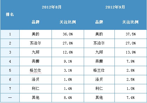 2012年9月,中国电压力锅市场品牌关注格局非常稳定。美的、苏泊尔和九阳分别保持前三甲位置不变,累计关注比例达到78.4%。其中,美的以37.5%的关注比例蝉联本月品牌关注榜冠军,关注比例较8月上升1.5%。苏泊尔维持亚军不变,关注比例为27.0%,较8月下降0.8%。九阳保持季军不变,关注比例13.9%,较8月上升1.3%。其他品牌位置保持不变,关注比例同前三甲相比差距较大。