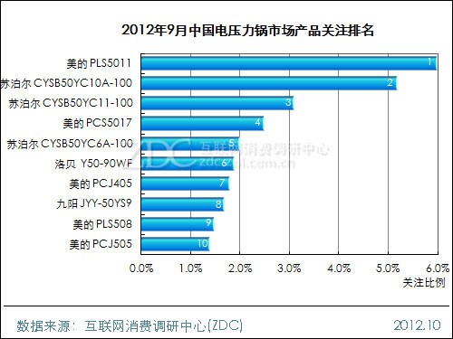 2012年9月,中国电压力锅市场上,美的PLS5011取代苏泊尔CYSB50YC11-100成为最受消费者关注的电压力锅产品,其关注比例为6.0%,较8月上升1.4%。这款5L容量、900W功率的电压力锅本月价格为499元,与上月持平。前十款产品被美的、苏泊尔、九阳和洛贝包揽,其中美的拥有五款,苏泊尔三款,九阳和洛贝各一款。