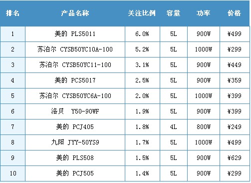 •产品关注格局:美的PLS5011取代苏泊尔CYSB50YC11-100成为最受消费者关注的产品,5L容积、900W功率的电压力锅产品较受消费者关注。