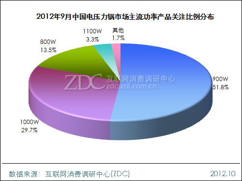 2012年9月中国电压力锅市场上最受消费者关注的功率仍为900W,关注比例超过市场的一半,达到51.8%,较8月下降1.3%。排在第二位与第三位的功率是1000W和800W,关注比例分别为29.7%和13.5%。1100W产品关注比例相对较少,只有3.3%。可见900W功率是中国电压力锅市场产品的主流功率。