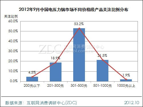 2012年9月中国电压力锅市场不同价格段产品关注比例分布
