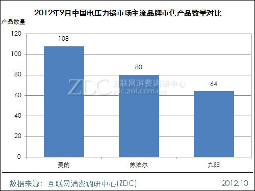 据ZDC统计数据显示,2012年9月中国电压力锅市场的前三强品牌中,美的市售产品数量最多,达到了108款,与8月持平。苏泊尔以80款位居第二。九阳的市售产品数量最少,仅为64款。