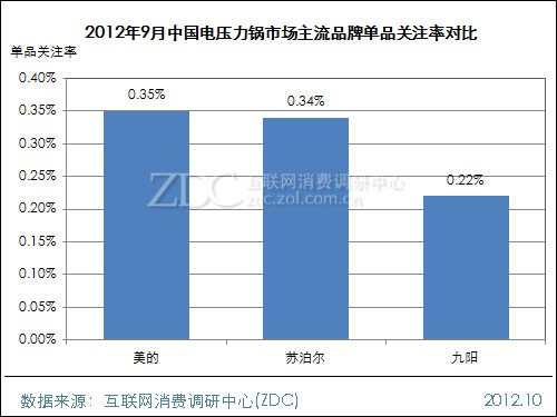 2012年9月中国电压力锅市场上主流品牌的单品关注率分别为美的0.35%、苏泊尔0.34%、九阳0.22%。可以看出美的不仅市售产品数量最多,其单品关注率也相对最高,市场关注优势比较明显。