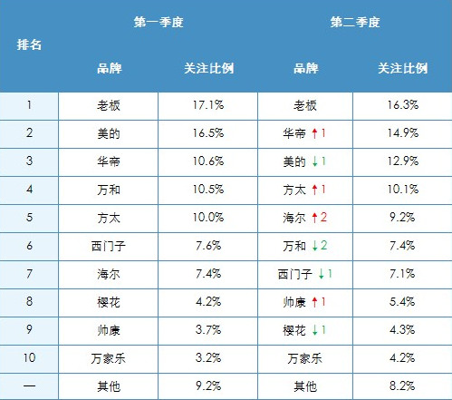 (表) 2012年Q1-Q2中国抽油烟机市场品牌关注比例对比