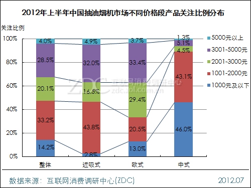 (图) 2012年上半年中国抽油烟机市场不同价格段产品关注比例分布