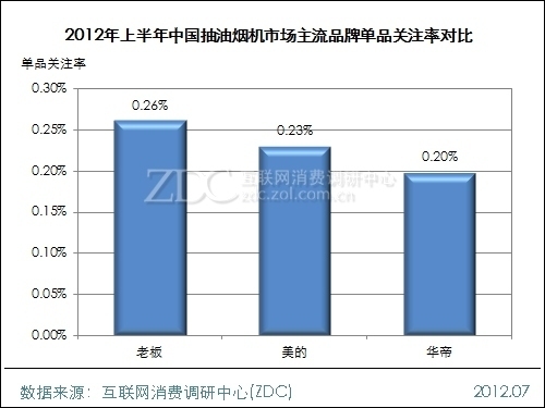 从单品关注率来看,三个主流品牌中老板略胜一筹,单品关注率达到了0.26%,美的以0.23%的单品关注率紧随其后,华帝为0.20%,也不容忽视。可见老板的品牌关注度相对较为集中。